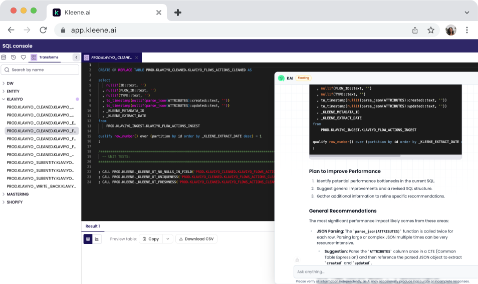 Generate and optimize SQL transforms. Describe the logic you need and KAI writes the SQL, informed by your live warehouse schema. Already have a transform that is running slowly or producing unexpected results? Paste it in and ask KAI to suggest improvements.