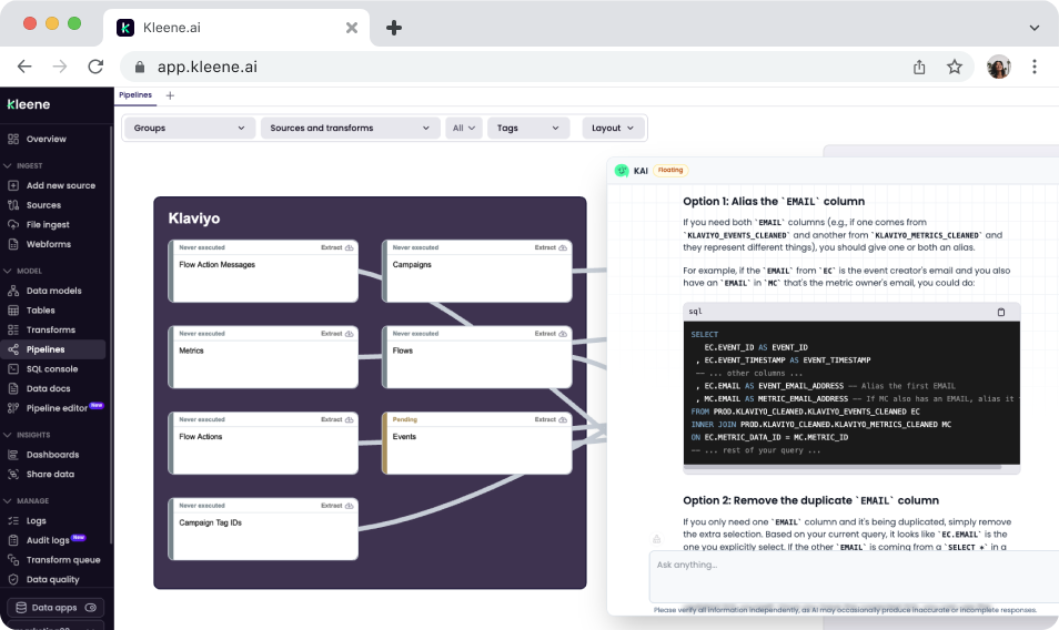 KAI Assistant is built natively into Kleene.ai rather than added on top of a separate analytics tool, and that distinction matters more than it might first seem. That means it covers a wider range of the daily workflow for both data engineers and analysts.