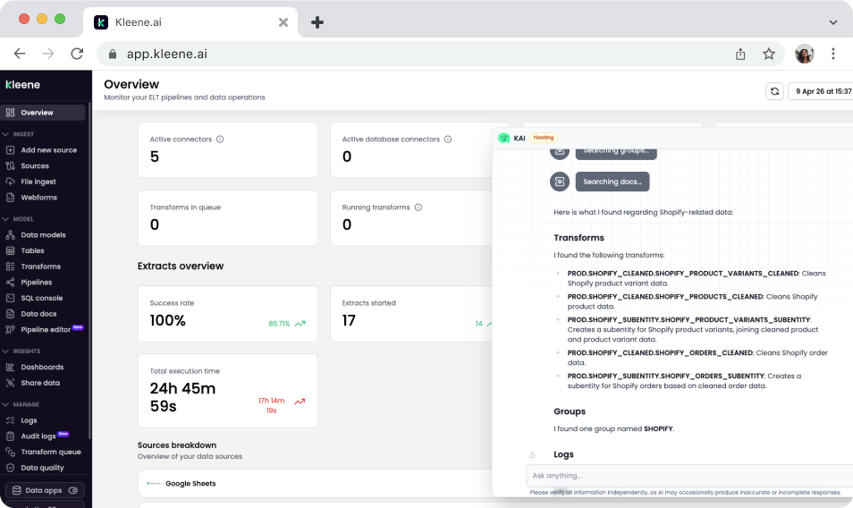 Answer Kleene.ai product questions instantly. For new team members or anyone hitting a feature they have not used before, KAI can answer questions directly from the Kleene.ai documentation without tab-switching or manual searching. The answers are grounded in the actual docs rather than a general understanding of how data platforms usually work.