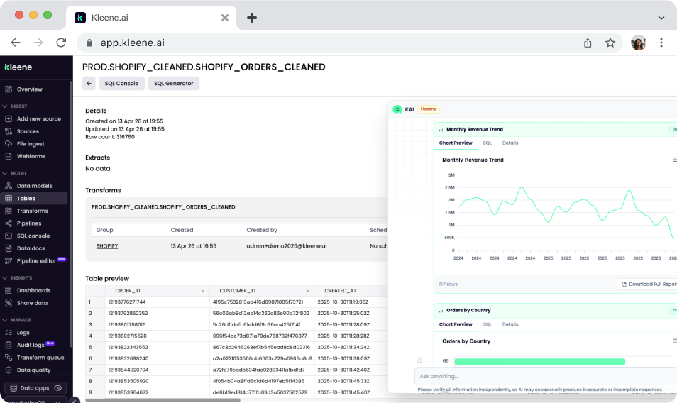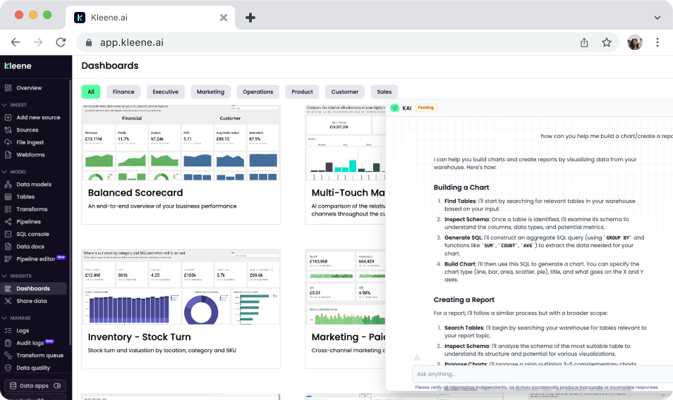 Kleene.ai with KAI Assistant operates across the full data platform rather than sitting at a single layer. Engineers can generate SQL transforms against their live warehouse schema, debug pipeline errors with context-aware suggestions, and search transforms and logs in plain English. Analysts and business users can ask KAI to visualize data inline as charts, pull table schemas on demand, and get instant answers from the Kleene.ai documentation, all without leaving the platform or switching tools.
