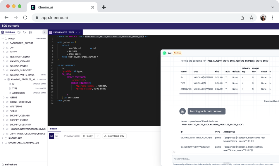 Pull table schemas and data previews on demand. Before writing a transform or running an analysis, understanding what the data actually looks like is usually the first step. KAI can return column names, data types, and sample previews from a plain English request, without running a manual query. When data previews are enabled, Kleene converts data to synthetic previews before any LLM processing, so raw customer data is not sent to the model.