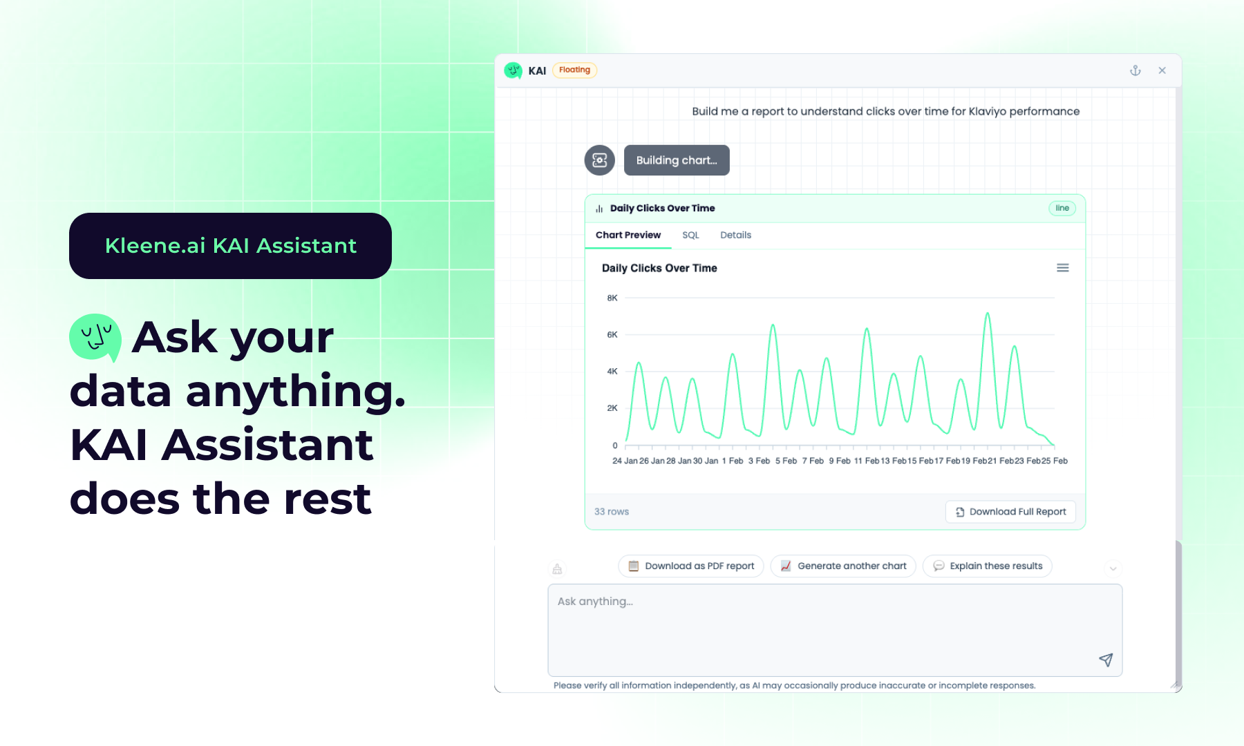 KAI Assistant is available now for all Kleene.ai customers across all plan tiers. To see it in action, visit kleene.ai/ai-data-assistant or book a demo at kleene.ai/talk-to-an-expert.